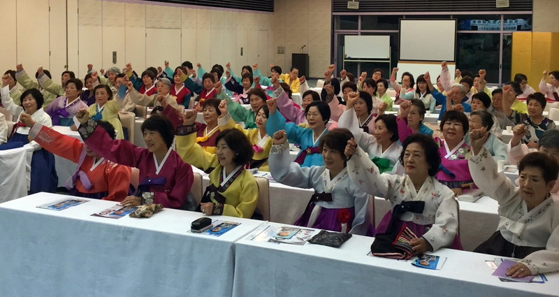 [ 締めくくりとなった中北地協の開会式で「ファイティング」と叫ぶオモニたち ]