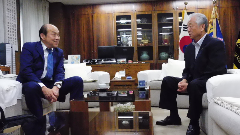 薩摩焼宗家15代・沈壽官氏(本名=大迫一輝)が4日、民団中央本部に呂健二団長を訪れ、懇談を持った。