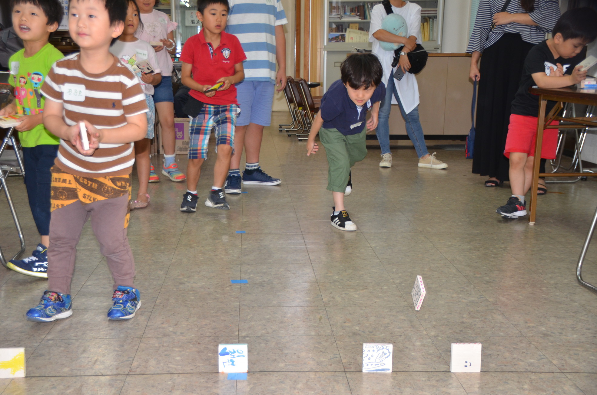 紙芝居が終わると禹さんのリードで全員、「カンガンスルレ」の一部を歌い踊った。ここでも歌詞には「ナムセンギ」が登場し、一貫性を持たせた。最後は昔ながらのピソックチギ(石飛ばし)を楽しんだ。石はフェルトペンやクレヨンで彩色をほどこした正方形の建材を使った。標物にあたると「オッシー!」と飛び跳ねて喜びを表現していた。