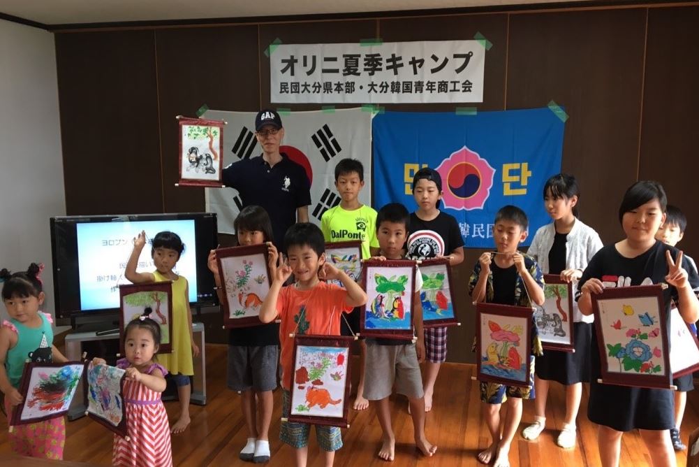 【大分】夏休みに入り、各地で民団主催のオリニキャンプが始まった。民田大分本部(呉成秀団長)では韓国民画にクレヨンで彩色を施し、オリジナルの掛軸を製作した。
