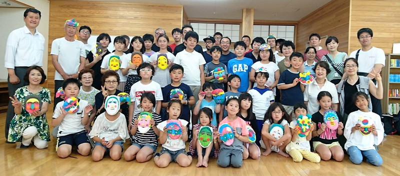 [ タル(仮面)づくりに挑戦しできあがった仮面を手に記念撮影をするオリニキャンプの参加者と指導に当たった先輩たち ]
