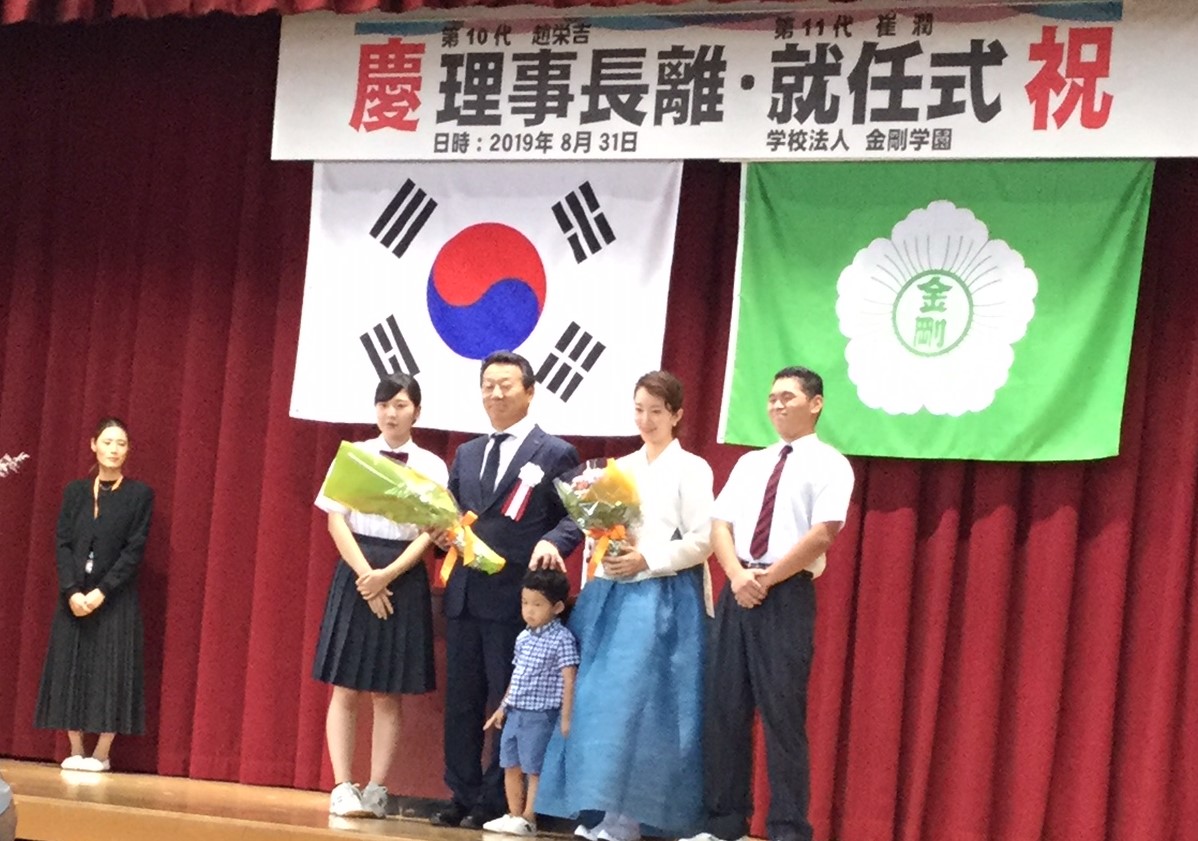 金剛学園(崔潤理事長、尹裕淑校長)の新旧理事長離・就任式が8月31日、同校体育館で行われた。在校生のほか、同学園の理事、PTA、校友会など関係者80人が見守った。