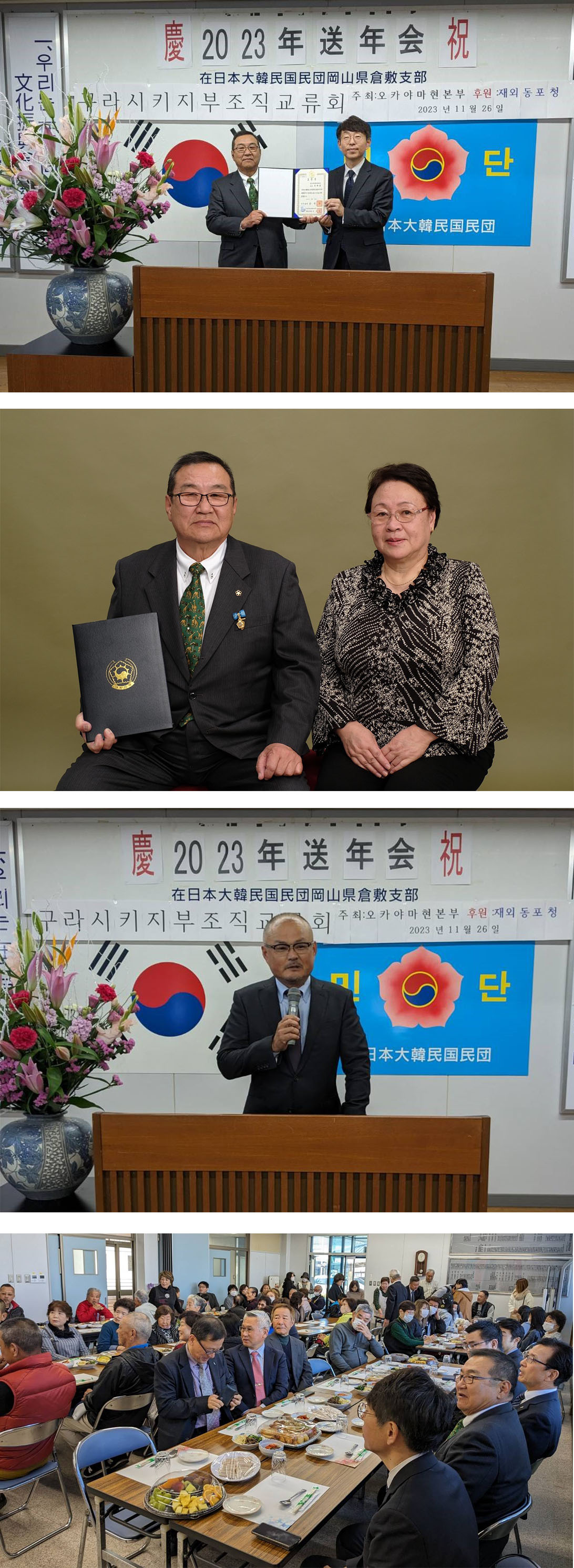 李大成 倉敷支部常任顧問が2023政府褒章「国務総理賞」を受賞され、送年会に先立ち、李相烈神戸総領事より賞状と記念品が伝達された。