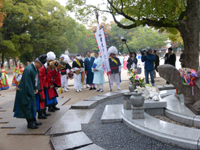 【広島】江戸時代の朝鮮通信使を再現した行列が17日、広島市中区の平和公園内にある広島国際会議場前を出発し、原爆慰霊碑や韓国人原爆犠牲者慰霊碑に花を手向け、祈りを捧げた。 再現行列を初めて見たというある市民は、「こんなにきれいなんかと、びっくりしました」と語った。 朝鮮通信使再現行列が広島市の平和公園を練り歩いたのはこれが初めて。朝鮮通信使の渡航ルートなどの世界遺産化をめざしているNPO法人「NGOひろしま」が、韓日の相互理解を深めようと企画した。 青年会広島県地方本部サムルノリサークルが楽隊として先導役を担い、広島に住む同胞と日本人がチョゴリを着て約100人の行列を構成した。「正使」役には李永煥駐広島領事が扮した。 青年会広島本部の宋達典会長は、「韓日関係が冷え込んでいるなか、小さい力でも、僕らから友好関係を築いていけたらという、そんな思いでやらせていただきました」と語った。 朝鮮通信使の「世界記憶遺産」登録をめぐっては、韓日双方で超党派の国会議員団も結成されている。国際会議場では世界遺産化を考えるフォーラムが開かれた。通信使は呉市下蒲刈にも立ち寄った歴史があり、なじみ深い。 (2013.11.27 民団新聞) |