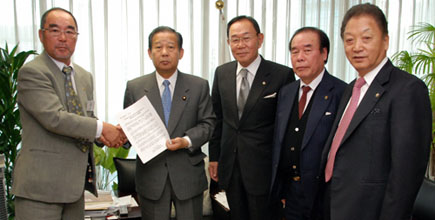 清和政策研究会共同代表の中川秀直・自民党前幹事長に要望書を手渡す権五源広島団長(右から4人目)、朴昭勝権益擁護委員会委員長(同3人目)ら