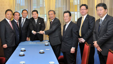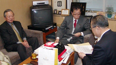 民主党の渡部恒三最高顧問に要望する金太河福島団長(右)と呂健二中央副団長