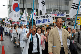 北韓による2回目の核実験に抗議する民団の街頭行進は、コンパクトながら同胞の憤激を結集した中身の濃いものとなった。