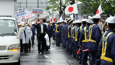 東京メトロの京橋駅から八重洲中央口に至るコース周辺では、参加者のボルテージは頂点に達した。白いレインコートに身を包み、「北核廃絶」「平和確保」「韓日連携」のプラカードを手にシュプレヒコールを繰り返すデモ隊に、道行く人や外国人観光客が目を丸くしながらシャッターを押す姿が目についた。