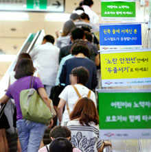 ソウル市内地下鉄5号線の西大門駅。「左側の列に立つ人を都市鉄道が応援します」などの広報用キャッチフレーズが掲げられているが、エスカレーターに乗る人の多くは右側に立っている。左側は急ぐ人のために空けておくことがエチケットとして認識されているためだ。右側だけに立つ人が多いと、機械摩耗やチェーン切断などの故障原因になりやすいという。