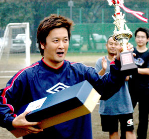 | | 熱戦が繰り広げられた第6回コリアンサッカーフェスティバル(写真は民団系チーム「ムグンファ」と総連系チーム「ムジゲ」による試合 | | | 優勝トロフィーを高々と手に喜びの「レアルコリア」の金庚徳代表 | 第6回コリアン・サッカー・フェスティバル(体育会関東会長杯)が11月3日、東京北区の西が丘競技場・補助グランドで開かれた。