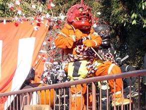 | | 大宮八幡宮の鬼追い式。韓半島ゆかりの面だ(ビデオから) | 【兵庫】兵庫県立西脇工業高等学校の放送部員は、郷土に残る韓半島ゆかりの史跡にスポットをあてたビデオ作品「北播磨のなかの朝鮮」(上映時間12分)を制作した。