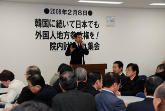 韓国国内の永住外国人が地方選挙で投票権を行使できるようになったことで日本でも永住外国人に地方参政権を付与するべきだとの声が高まっている。8日に参議院議員会館で開かれた院内討論会・集会には民主党と公明党、共産党の国会議員13人がマイクを握り、相次いで賛成意見を述べた。この日の院内集会は民団地方参政権獲得専門委員会と青年会、市民団体による4団体共催。会場は参加者200人余りで盛り上がった。