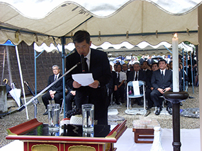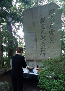 | | 慰霊碑の前で焼香する | | | 民団埼玉本部を代表して孫準監察委員が追悼辞を読んだ(写真は上里町の安盛寺) |