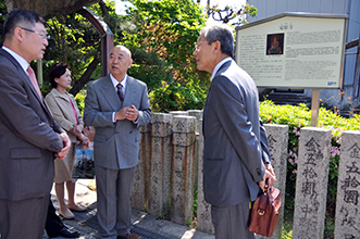 行基上人もカミングアウト 【大阪】古代から韓半島と豊かな交流があったことで知られる堺市。市内には歴史的な関わりを示す重要な史跡も多い。こうした「堺の中の韓国」を内外に発信していこうと、市は3月末までに市内4カ所の施設案内版の記述内容に書き加え、韓国語表記も入れた。これは民団大阪・堺支部(呉時宗支団長)からの6年越しの呼びかけに応えたもの。8日には駐大阪総領事館から李賢主総領事らが視察に訪れた。 施設案内版4カ所に加筆 家原寺は行基上人の生家跡。境内には行基菩薩の銅像が建つ。境内の施設案内版には行基の社会文化事業における幾多の業績についての記述に先だって、百済につながる行基上人の出自が韓国語と日本語、英語、中国語の4カ国語で次のように書き加えられた。 「飛鳥・奈良時代の高僧行基(668〜749)は、この地で生まれ、父の高志才智は、百済から渡来した王仁を祖先とする一族で、母は蜂田首虎身の娘の古爾比売とされています(『大僧正舎利瓶記』より)」。同様の記述の加筆は、行基上人が創建に関わった大野寺や土塔の案内版でも確認できた。 また、古代の窯跡「陶邑窯即跡群」(泉北地域)の施設案内版には、新たに「この須恵器は朝鮮半島から伝わった最新技術によって製作されたもの」という一文が加わった。 市内には行基の業績を顕彰するための「堺行基の会」という市民の会もあるほど「堺市の人気者」だ。しかし、その出自にまで関心を持つ人は少ないという。 民団堺支部の呉支団長は、「明治時代から続く韓国隠しの影響で、ほんとうの事実から目をそらしているのでは」と考えた。それならばと取り組んだのが、市民啓発のための歴史講座「堺と韓半島のつながり」だった。「堺の魅力づくり」と銘打ったこの市民自主事業は民団支部が主催。市も年間100万円近い財政支援で後押しした。 歴史講座は07年度から10年度まで計10回にわたって続き、好評を博した。取り上げたテーマは堺と縁の深い王仁博士、行基上人といった渡来人、須恵器と古墳、朝鮮通信使など。10年6月には締めくくりとなる「古代遺跡と日韓文化交流」と題した大がかりな特別講演会も共催した。 一方で毎年、市長と教育長には文書で施設案内版の書き換えを求めてきた。ようやく、市は13年度要望書への回答のなかで「施設案内版の記述内容の見直しを検討する」と表明するに至った。 呉支団長はこれらの成果を活かし、韓日間の青少年交流を活性化させていきたい考えだ。「行基さんもカミングアウトできて喜んでいるだろう。これから堺に残る歴史文化遺産をテコに韓国から多くの観光客を呼びたい」と話している。 韓国にアピール 李総領事は8日、堺市庁舎に竹山修身市長を表敬訪問した。民団堺支部から呉支団長をはじめとする役員多数が同席した。 李総領事は、「韓国と日本が草の根レベルで交流しあえる土台ができたことはうれしい。韓国と日本の関係がもめているなか、市と民団はよく頑張った」と称えた。 これに対して、竹山市長は「呉支団長という強力なパートナーがいてくれたことが大きい。これを機会に堺市を韓国にアピールしていきたい」と抱負を述べた。 (2014.5.14 民団新聞) |