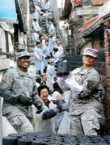 木枯らしの季節を迎え、オンドルなどに使う練炭が路上に山積みにされる風景があちこちに見られる。ソウル市西大門区の弘恩洞では6日、在韓米軍将兵40人余が、老人や恵まれない人々のために、韓国外国人親善文化協会やセマウル婦女会員、赤十字ボランティアらとともに練炭配達に汗を流した。