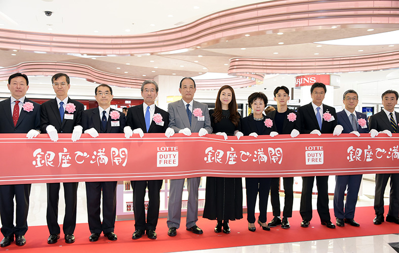 | | テープカットに臨んだ韓国ロッテグループの辛東彬会長(左端)ら | 来年 新宿や大阪にも
