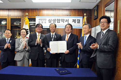 民団中央本部の呉公太団長は4月12日、江原道の崔文洵知事との間で、2018平昌冬季五輪の成功開催と相互の共同発展を図るため、「相互協約書」を締結した。協約書は1,民団が平昌五輪の参観団1000人を目標に努力,2江原道は参観団募集へ積極支援3,民団は日本で五輪広報と雰囲気醸成に積極協力−など5項目。あわせて民団は募金運動も開始した。