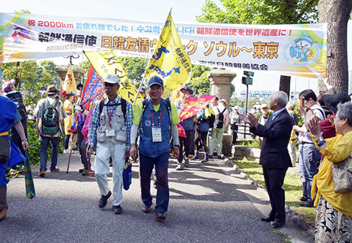 4月1日にソウルを出発した「第6次21世紀の朝鮮通信使 ソウル−東京友情ウオーク」の韓国・日本・在日ウオーカーが5月22日、ゴール地点の東京・日比谷公園に到着し、出迎えの人たちの大歓迎を受けた。総参加者は延べ2756人に達し、52日間で約2000キロを歩き、「朝鮮通信使」の世界記憶遺産登録を広くアピールした。