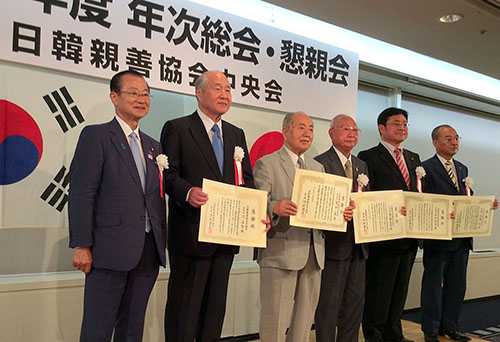 日韓親善協会中央会は5月22日、2017年度年次総会を都内のホテルで開催した。河村建夫会長は、韓国の文在寅大統領の就任に触れ、「日韓関係の改善と親善交流の深化に向けて、新大統領が指導力を発揮されることを期待する」と述べた。また、昨年が中央会の創立40周年であったことを記念して、全国各地で長い間、草の根的に日韓親善に尽力してきた39人を表彰した。