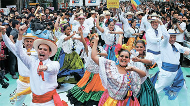 「天安興打令祭り」(忠清南道の天安市、7日まで)で行われたダンス競演には23カ国から238チーム、約6000人が参加した。それに先立ち、コスタリカ舞踊団がソウルの明洞で街頭行進のさなか、歌手PSYのヒット曲「江南スタイル」に合わせて「馬ダンス」を披露し、市民から喝采を浴びた。