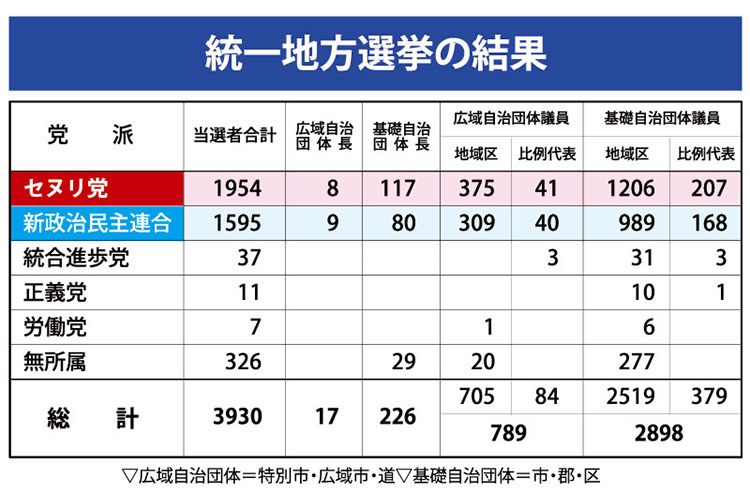 ■□ 政府「安定論」VS「審判論」 一方には加担せず…「7・30ミニ総選」に持ち越し 史上6回目の統一地方選挙は、韓国社会に一大衝撃をもたらしたセウォル号の沈没(4月16日)から49日目、不明者の捜索がなお続き、沈うつな雰囲気が消えない特殊な状況下で実施された。 結果について識者やメディアは、「引き分け」「与野党双方に今一度の警告と機会を与えた」とする見方でほぼ一致している。朴槿恵大統領と与党・セヌリ党には執権主体としての自省を強く求める一方、野党・新政治民主連合には与党を牽制する力を与えながらも凌駕はさせず、執権準備政党として政策中心主義への脱皮を促すメッセージを送ったとの解釈だ。 課題を先送り 朴大統領の支持率は就任2年目としては歴代最高の60%台前半で推移し、セヌリ党も新政治民主連合に20%近い差をつけていた。野党側は選挙を戦う有効なテコを用意できない状況にあったとさえ言われた。 そこに、最大変数として浮上したのがセウォル号惨事だ。韓国社会の積弊が招いた人災であるのに加え、政府当局が初動対応で不手際と混乱を見せつけたことは、野党にとって想定外の追い風となり、与党には逆風となった。 国民の悲憤や責任追及世論を背に「セウォル号審判論」を前面に押し出す野党の前に、防戦一方となった与党は「朴大統領を助けるために1票を!」と訴えるまでに追い込まれた。結局、地方選挙でありながら朴槿恵政府をめぐる「安定確保論」(与党)と「審判論」(野党)の激突に終始した。 そこにはまた、与野党ともに実績が乏しい事情もあった。だからこそ、野党は沈没惨事に便乗し、与党は急落しても50%前後の底堅い支持率を維持する朴大統領にすがった。結果を見れば、与党は絶対不利の逆風をしのぎ、野党は追い風に乗り切れなかったことになる。 12年12月の第18代大統領選挙では、首都圏と地方の人口・経済格差を背景に、農漁村地域の振興を与野党とも主要政策に掲げた。今回の統一地方選は、その公約をより具体化する場となり得たはずである。しかし、2割自治と皮肉られる構造的な問題や地域振興策は争点化せず、深刻な課題を先送りしたことは否めない。 積み残しの罪 沈没惨事は確かに、政府当局の無能ぶりを浮き彫りにした。しかし、野党も勢い余って滑り過ぎた感が強い。「朴大統領が人間の価値を軽視したのが原因だ」「朴政府が『朴フィア』(朴大統領とマフィアの造成語)を任命したせいだ」といった主張がそうだ。 野党は李明博前大統領までまな板に乗せた。建造から20年が経過した船舶(セウォル号のこと)が輸入され、運航されていたのは、李政府時代の09年に海運法施行規則を改定し、旅客船の運用可能船齢を20年から30年に引き上げたためだという理屈である。 そうなれば責任・原因はさらにさかのぼる。清海鎮海運を含む国内旅客定期航路事業者に対し、安全管理体制の確立や施行の義務を免除したのも、韓国沿岸で運航する旅客船にも03年から国際安全管理規約を適用しようとしながら、02年10月に準備不足を理由に断念したのも金大中政府だ。その主務官庁は海洋水産部であり、準備期間中に長官を務めていたのは後に大統領となる盧武鉉氏だった。さらに、船員の負担を軽減するとの理由で救命ボートの使用訓練など安全教育を事実上免除したのも、盧武鉉政府下でのことである。 セウォル号沈没を大惨事にした最大の責任が時の政府にあることは否定できないとしても、歴代政府の積み残しに罪過があることもまた無視できない。朴大統領とセヌリ党に攻撃を集中させるには無理があったと見るべきだろう。 注目の再・補選 与野党は、12議席(6議席追加の可能性も)を争う7月30日の国会議員再・補選で再び激突する。勝敗は延長戦に託されたといっても過言ではない。 セヌリ党からは鄭夢準氏ら7人、新政治民主連合からは3人が国会議員職を辞して自治体首長選挙に出馬した。この10人に12年4月の総選挙における選挙違反確定者2人(セヌリ党1、新政治民主連合1)が加わる。ほかにも大法院の宣告待ちが4人(セヌリ党2、統合進歩党1、新政治民主連合1)、破棄差し戻し審が進行中の2人(セヌリ党1、新政治民主連合1)、計6人がいる。 新政治民主連合の報道官は5日、「(選挙結果は)与野党が力を合わせ、新しい韓国をつくれという国民の命令」であるとし、「謙虚に受け止める」と表明した。まさに、その通りであろう。 しかし、すでに稼働している国政調査を中心に「セウォル号国会」が本格化する。国務総理など政府人事や、「安全韓国」への国家改造プロジェクトの在り方をめぐって与野党の攻防が激しくなるのは必定だ。7・30ミニ総選でこそ、国民のより厳しい判断が下されるのかも知れない。 ■□ 屈折した投票行動 セ号ショック重く…仁川・京畿の低調際立つ 今回の統一地方選における有権者の意識はかなり複雑だったのではないか。史上2番目に高い56・8%の投票率についても評価は分かれる。初めて実施された期日前投票が11