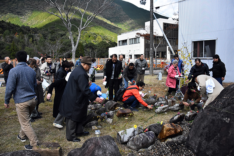¡¡Èê¤ÎÁ°¤Ë¤Ï»àË´¼Ô¤Î̾¤òµ¤·¤¿35¸Ä¤Î¾®¤µ¤ÊÀФ¬ÃÖ¤«¤ì¤Æ¤¤¤ë¡£»²Îó¼Ô¤Ï¤½¤Î°ì¤Ä¤Ò¤È¤Ä¤Ë¸¥²Ö¤·¤Æ¸¥ÇÕ¤·¤¿¡£