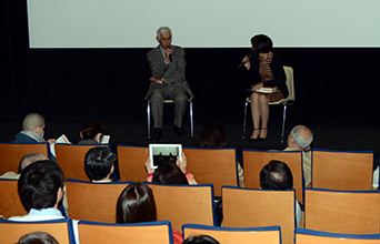 | | 上映終了後のトークイベント。北朝鮮難民救援基金の加藤博理事長(左)が北韓の人権侵害について語る |