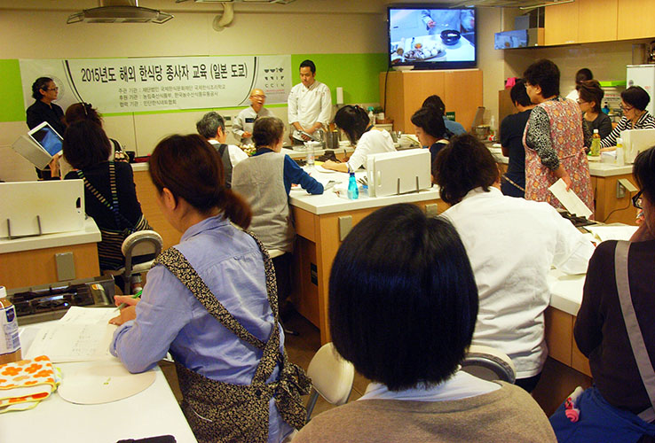 韓国料理のプロを養成する第7回韓食世界化専門人養成スクールが10月13日から29日まで、東京新宿区のカナダラクッキングで行われた。 全州国際韓食調理学校が主催、民団韓食ネット協議会と韓国農水産食品流通公社が後援。 スクールは調理を学ぶ料理講習会と韓国料理店の広報や経営戦略について学ぶ経営者・ホールスタッフ講習会の2種類。どちらも申し込みが殺到し定員を増員した。 受講者は各コース20人。首都圏だけでなく関西や四国からも。韓食とのコラボのため参加したフレンチレストランの料理人もいた。 とくに今年はハイレベル化を図り著名人を講師に招いた。世宗ホテルや新羅ホテルをはじめ、駐米韓国大使館の料理長も務めたチョ・ヒスクさんの授業は大人気。 日本の食材をアレンジした韓国料理や自身の創作料理などを披露すると受講生たちは目を輝かせた。 初参加者も多く「今まで知らなかった」という声もあり、主催者側は「今後、広報活動をさらに強化したい」と語っていた。 (2015.11.4 民団新聞) |