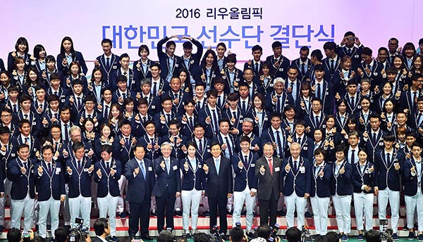リオ五輪(8月5〜22日)に出場する韓国代表選手団(鄭夢奎団長)の結団式が19日、ソウルのオリンピック公園内オリンピックホールで開かれた。鄭団長以下、300人余りの選手・役員が一堂に集まる中、黄教安首相、金鍾徳文化体育観光部長官ら政府要人とスポーツ関連機関役員ら1000人がつめかけ、リオ五輪での健闘を誓った。