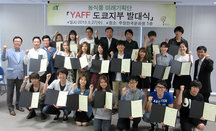 韓国農水産食品流通公社は5月27日、東京・新宿の韓国文化院でYAFF東京発足式を行った。 YAFF(Young Agri‐Food Fellowship)は学生の国際交流等を通して韓国食文化や食品のPR、新しいアイディアを発掘するプロジェクト。すでに韓国国内でも実施されており、14年12月時点で韓国の121の大学1507人の学生がメンバー登録し、参加している。 K‐POPをはじめ様々な韓流文化が世界に広まっている中、韓国の食文化「K‐FOOD」も世界各国でブームを呼んでいる。 同プロジェクトはさらなる韓国食文化のPR基盤強化と新たな政策を発掘していくため、海外各国の文化に慣れ親しんだ韓国人留学生をグローバルメンバーとして募集していた。 東京支部の選抜されたメンバーは11大学30人で今後、展示会やイベントの運営、通訳、大学内での韓食PR、SNSによる拡散など様々な活動を展開する。 (2015.6.10 民団新聞) |