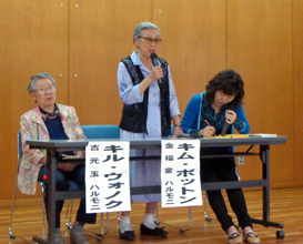 【奈良】韓国人元「慰安婦」2人が17日から訪日。沖縄、広島、大阪に続いて26日は奈良市の県人権センターで証言した。2人はこの20年間、駐韓日本大使館前で行われる抗議の「水曜デモ」に参加している。しかし、期待していた日本政府からの心からの謝罪がないことから、「歴史の事実を知ってほしい」と、あらためて日本にやってきた。 金福童ハルモニは15歳のとき、軍服工場に行くとだまされ、旧日本軍の施設で「性奴隷」にされたという。「日本人はあまりにも過去の歴史を知らない」と前置きし、「日本にきてみると、韓国人帰れという言葉を聞いて、とても悲しい」と話した。また、もう1人の吉元玉ハルモニが「慰安婦」にされたのは13歳のとき。「日本政府からの謝罪があれば、心が癒されるのに」と訴えた。 2人は橋下徹大阪市長の一連の発言に、「そういう人が市長の座に座っていることにあきれるばかり」と批判。安倍首相に対しても「過去の清算を急いでほしい」と結んだ。 会場からは「話を何度聞いても涙が出てしまいます」「2人の話しを聞いて私は何をしなければならないのかと考えています」との声も。 集会は日本軍「慰安婦」問題・関西ネットワーク、アイ女性会議なら、多文化共生フォーラム奈良、部落解放同盟県連合会女性部が共催した。 (2013.5.29 民団新聞) |