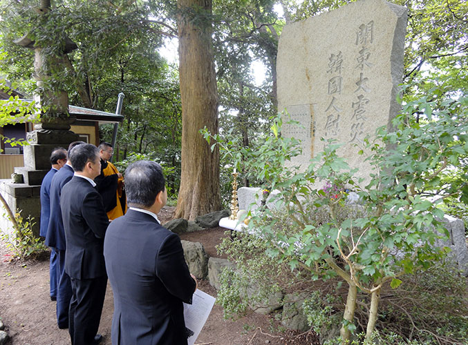 民団神奈川本部(金利中団長)は横浜市南区の宝生寺で追悼法要を行った。役員を中心に50人余りが参列。本堂での読経が終わると境内に建つ「関東大震災韓国人慰霊碑」前で頭を垂れ、全員で焼香した。