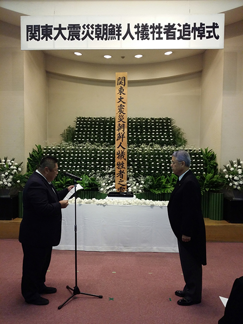 代表して献花を行った張支団長は「一部で関東大震災による同胞虐殺の事実究明どころか、歴史そのものを消そうとしている動きが起きている」と批判し、「この地で子子孫孫平和で暮らせるよう、共存共栄社会の構築に努力する」と誓った。
