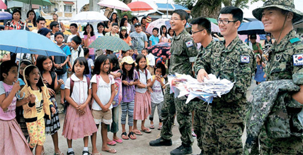 昨年、台風の被害を受けたフィリピン・レイテ州のセントラル小学校を復旧した韓国合同支援団アラウ部隊に対して13日、同校の子どもたちが感謝の手紙を手渡した。同部隊は年末まで、学校や孤児院、保育園、病院など50カ所以上を復旧する計画だ。