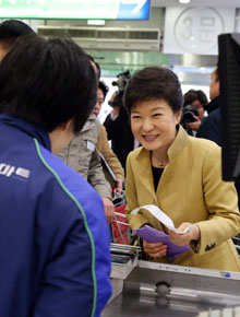 朴槿恵大統領が就任してから1カ月余り。彼女の一挙手一投足が内外から注目されている。 今月13日、ソウル市瑞草区の農協系スーパーで買物をし、淡い黄色のジャケットを着た朴大統領が薄紫色のキルティング財布を取り出した。 この財布が工芸会社「ソサンダン」の商品で4000ウォンということがネットユーザーにより判明するや、注文が殺到し、瞬く間に品切れになった。 洋服との組み合わせで身につける、さまざまな形・色のブローチも同じだ。 よく使用する真珠の玉が打ち込まれた銀色花模様のブローチは南大門市場で9000ウォンの商品。自然石で黄玉花模様のブローチは所持品の中でも高額で、卸売価格2万ウォンだという。 このように大統領が庶民的な商品を愛用していることから、百貨店でも「朴槿恵スタイルブローチ」というキャッチフレーズで特別コーナーを設け、似たような模様のブローチが飛ぶように売れている。 業者たちは「このようなムードが続けば、庶民経済が良くなるような気がする」と期待を寄せている。 (2013.3.27 民団新聞) |