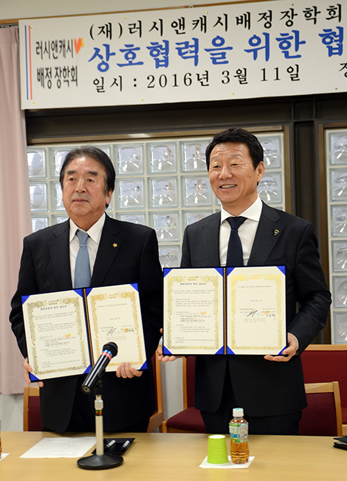 同奨学会は金剛学園、白頭学院など関西地区の韓国系学校4校とはすでに同様の「協定書」を締結済み。茨城県の青丘学院つくば中学校・高等学校(金正出理事長、金正龍校長)と東京韓学だけを残していた。この日、青丘学院とも同様の協定書を交換した。