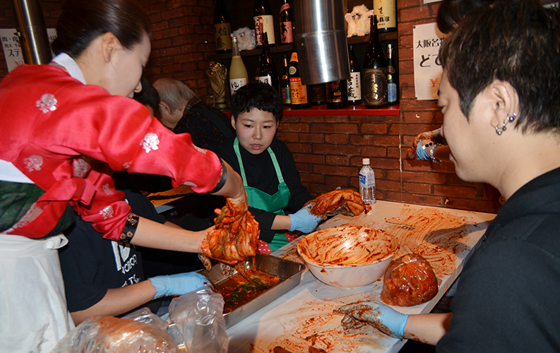 東京・杉並区の阿佐ヶ谷かわばた通りで21日、地元の商店街「川端新興会」が、第1回キムチづくりを行った。「地域特性に合ったまちおこし」の一環で、杉並区から商店街支援事業の一つに認められた。 商店街でスナックを営む矢野琴さんが、地元名産の高井戸節成きゅうりをキムチに活かせないかと知人の金日権さんに相談。金さんから連絡を受けた民団韓食ネット協議会(崔千浩会長)が趙善玉副会長(伝統・薬膳料理研究家)を講師として派遣した。 この日は商店主中心に10人が参加。趙さんからヤンニョムづくりの初歩から指導を受けた。ある和食の料理人(39)は日本の漬けものと比較しながら、「塩に漬け、丁寧に熟成させるのは同じ。キムチは漬けた瞬間から美味を増す」と感想を述べた。 来年は1月23日に第2回を計画している。矢野さんは、商店主がキムチを漬けてブームになれば、店舗で販売する日が来るのも遠くはないと見ている。川端新興会には深夜営業の飲食店を中心に102店舗が加盟。 (2015.11.25 民団新聞) |