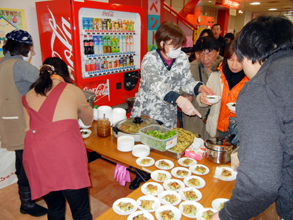 【福島】市民団体が自慢の鍋を持ち寄り、味を競いあうイベントに民団福島本部(禹日生団長)が5日、トック(韓国餅スープ)で参加した。地元の郡山商工会議所が主催、毎月第1日曜日を「まちなかの日」として市内中心街で実施している催しの一つで、題して「まちなか鍋合戦」。8団体が豚汁、芋煮、カレーなどの鍋を出品、市民に一杯100円で販売した。「震災による暗い雰囲気を少しでも明るくしたい」との趣旨に賛同して参加した民団福島本部は、市民投票の結果、「特別賞」を受賞した。 (2012.2.8 民団新聞) |