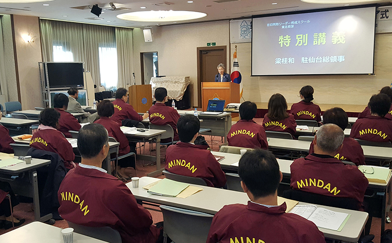 河政男民団中央事務総長による「同胞社会と民団の歴史と役割」や權清志企画調整室長の「ヘイトスピーチ」、梁桂和駐仙台総領事による特別講義「大韓民国の発展と在日同胞の貢献」など、7カリキュラムを受講した。