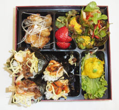 | 上野の西郷サンもあっと驚く花見弁当 豚肉スライス、鶏もも肉、えび、厚揚げ、パプリカ、万能ねぎ、菜の花、サンチュ、生しいたけ、卵 キムチを厚揚げに挟んで |