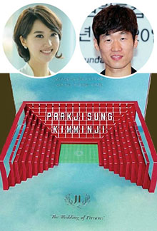 飛び出すスタジアム マンチェスター・ユナイテッドや京都サンガなどで活躍し、昨季終了後現役引退した元韓国代表MF朴智星(33)が、27日にソウルで予定している韓国の元SBSアナウンサー、キム・ミンジさん(28)との結婚式のために作成したユニークな招待状が話題となっている。 招待状は開くと、朴智星が7年間在籍したマンチェスター・ユナイテッドのスタジアム、オールド・トラフォードが飛び出す仕組みになっており、スタンドに朴とキムさんの名前が記されている。 また、クラブのスローガンである「シアター・オブ・ドリームズ=夢の劇場」をもじって「ウェディング・オブ・ドリームズ=夢の結婚」と書かれている。 (2014.7.16 民団新聞) |