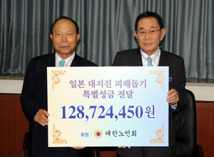 義捐金は大震災の直後から全国の老人会聯合会を通じて会員1人あたり2000ウォンを目安に呼びかけた。伝達式は全国の老人会聯合会会長が見守るなか、ソウル市内の同老人会中央会会議室で行われた。