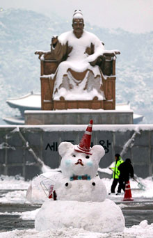 立春の4日早朝までに、ソウル市内に16.5センチの雪が降った。今冬一番の積雪量で、2月としては2001年(23.4センチ)に次ぐもの。光化門広場の世宗大王像前には雪だるまが登場した。
