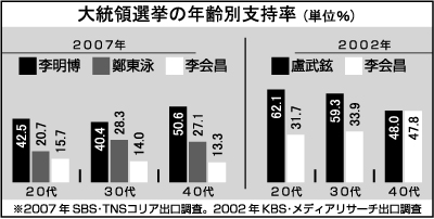 今回の大統領選挙の大きな特徴の一つは、「脱世代」と「脱理念」である。5年前の大統領選挙で盧武鉉候補勝利への牽引役を果たしたのは20・30代の若い世代の支持であった。当時の出口調査によると、20代では62・1%が、また30代の59・3%が盧候補に投票した。ちなみにこの時の盧大統領の得票率は48・9%で、李会昌ハンナラ党候補との票差は57万980票(2・3%)だった。