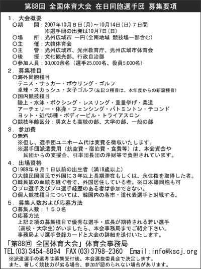 今年の国体は、10月8日から14日まで、光州広域市で開催され、開会式は光州ワールドカップ競技場で行われる。在日同胞選手団の参加種目は、15カ国の海外同胞が対戦する海外同胞種目として、テニス、ボウリング、ゴルフ、サッカーのほかに、今年度より女子ゴルフ、卓球、スカッシュが新設された。