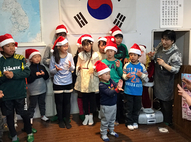 金支団長は「今日は一日、楽しく過ごしてください」とあいさつ。オリニたちは「キラキラ星」の歌を韓国語で歌い、会場を和ませた。また、同支部韓国語講座に通っている日本の生徒たちもクリスマスソングを韓国語で披露した。