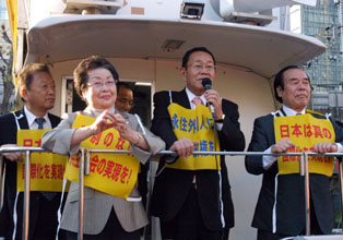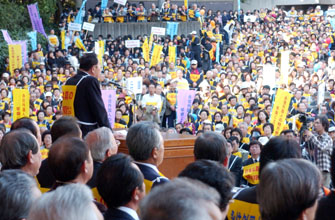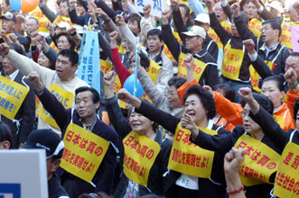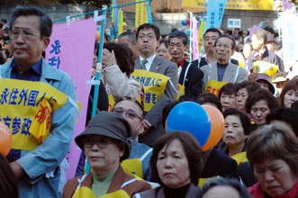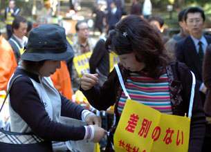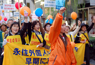 「なんとしても、定住外国人の地方参政権を実現させよう!」−−11・7決起大会の会場となった日比谷野外音楽堂は、子どもから老人まで全国から結集した5000人の参加者で熱気に包まれた。家族ぐるみで参加するなど予想を超えた同胞の結集に、改めて民団の底力を感じていた。街頭行動中に反対グループを目にしたときは、逆に闘志をかき立てられ、地方参政権を必ず勝ちとるという決意を膨らませた。11・7決起大会・デモを写真で追った。