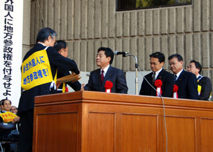 「地方参政権を付与せよ!」。そろって右腕を力強く突き出して