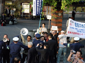 デモ隊を見送る白真勲参議院議員(右)