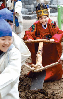 ソウル市(中区忠正路)の農業博物館で3月に開催された「親耕儀礼」イベントに、小学生らが参加し、すき込みを体験した。「親耕」とは、朝鮮朝時代に農業の重要性を認識させるため、王が直々に耕作した儀礼。